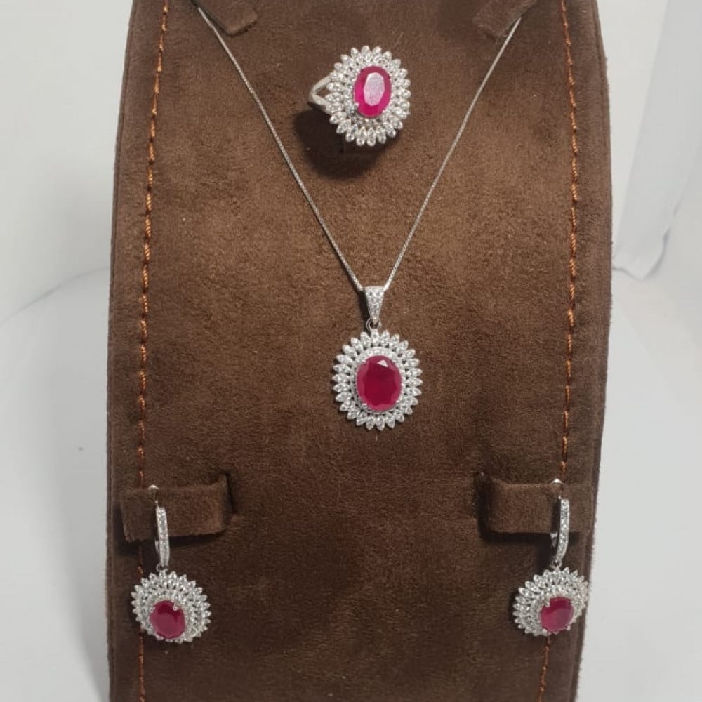 طقم فضة ناعم يأسر الأنظار بجمال تصميمه، يتميز بقطعة رقيقة وأنيقة من الفضة مع حجر أحمر ساحر وزركون يلمع كالألماس، فهذه القطعة تعكس الأناقة والجمال معًا، تتناغم مع جميع المناسبات وتعتبر هدية مثالية تعبر عن الأناقة والذوق الرفيع.